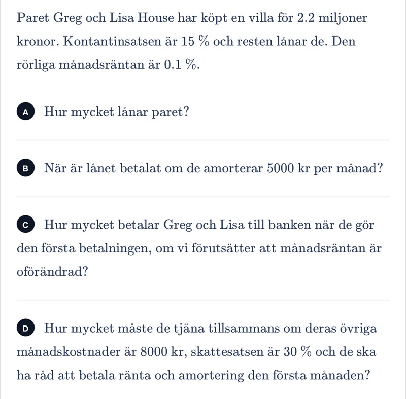 vi ska beräkna hur mycket de minst ska tjäna tillsammans för att de ska ha råd att betala ränta och amortering första månaden