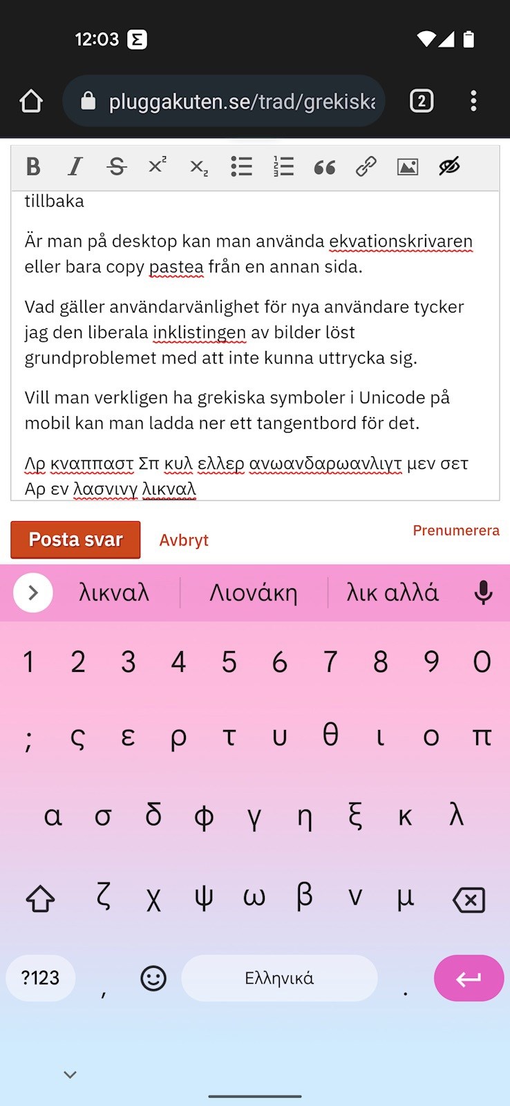 Vill man verkligen ha grekiska symboler i Unicode(?) på mobil kan man ladda ner ett tangentbord för det.