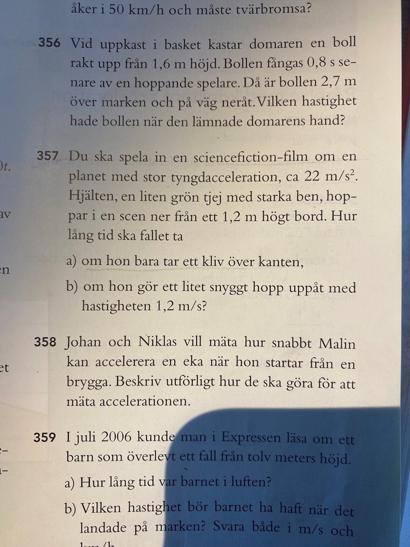 På fråga a) tänkte jag att tyngdaccelerationen är negativ och hastighet som rör sig nedåt är negativ.