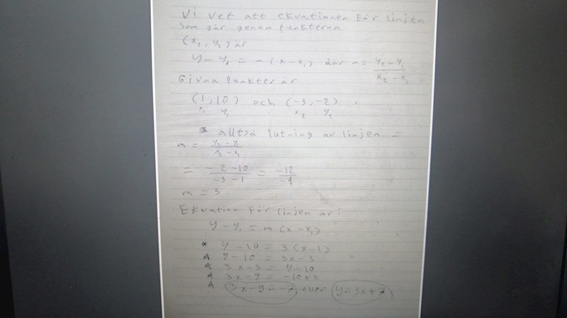 Frågan: Bestäm en ekvation för den räta linje som går genom punkterna: (1; 10) 𝑜𝑐ℎ (−3; −2)