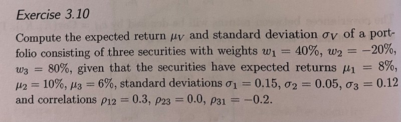 Min första tanke var att använda formeln E[Kv]=wmT där w=weights matrix och m=expected return for each asset/security, där jag antog att m=[0.08 , 0.1, 0.06] eftersom att de är de expected returns som används i 3.14 men detta resulterar i fel svar.