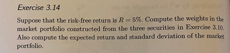 Enligt facit är svaren till 3.14 följande: Weights =[0.438 , 0.012 , 0.550], expected return = 0.183. Och jag vet hur de får fram värdena på våra weights men det jag inte lyckas få till är hur de får fram expected return of the market portfolio.