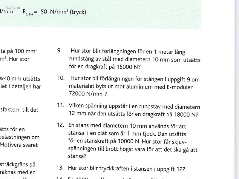 Hej! Uppgift nummer 12 förstår jag inte. Frågan frågar efter vad den maximala Rm gränsen är och för att få den behöver jag u hitta tau och dividera det med 0,6 eftersom den maximala spänningen för brottgränsen hittar du genom att multiplicera det med 0,6. Jag har hittat arean av stansen men den är inte till hjälp eftersom jag inte har någon aning om vad F är, det vill säga kraften. Sedan kan jag inte använda formulan för plåten eftersom det enda jag vet är att den är 1mm tjock. Jag behöver hjälp har jag förstått frågan eller inte, vad är det dem frågar efter?
