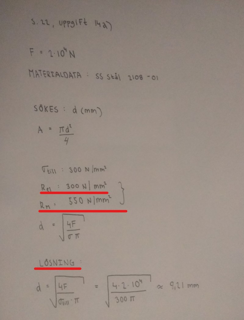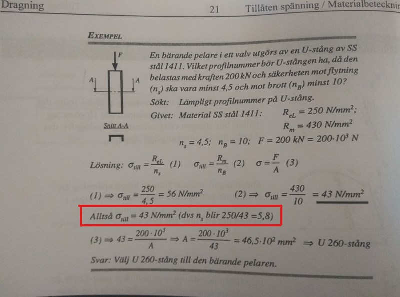 2. Det står ju att du tillåter en tredjedel av sträckgränsen som är 300 MPa vilket blir 100 MPa.