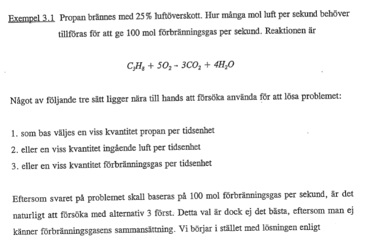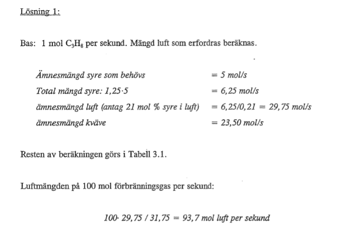 Vad är det som händer här egentligen? Har man bara bestämt att inflödet är 1 mol propan per sekund? Och vad menar man med "förbränningsgas"? Är frågan hur många mol luft man behöver per sekund för att producera 100 mol CO2 per sekund? Vad menar man med att luftöverskottet är 25 %? Menar man molflödet luft är 25 % större än det som behövs eller menar man att molflödet syre är 25 % större än det som behövs?