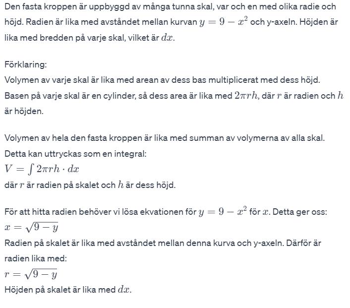 Du skriver i början att höjden på varje skal är dx, men det stämmer inte. Varje skal har en tjocklek som är dx, men höjden är h, som beror av x enligt h = 9-x2.
