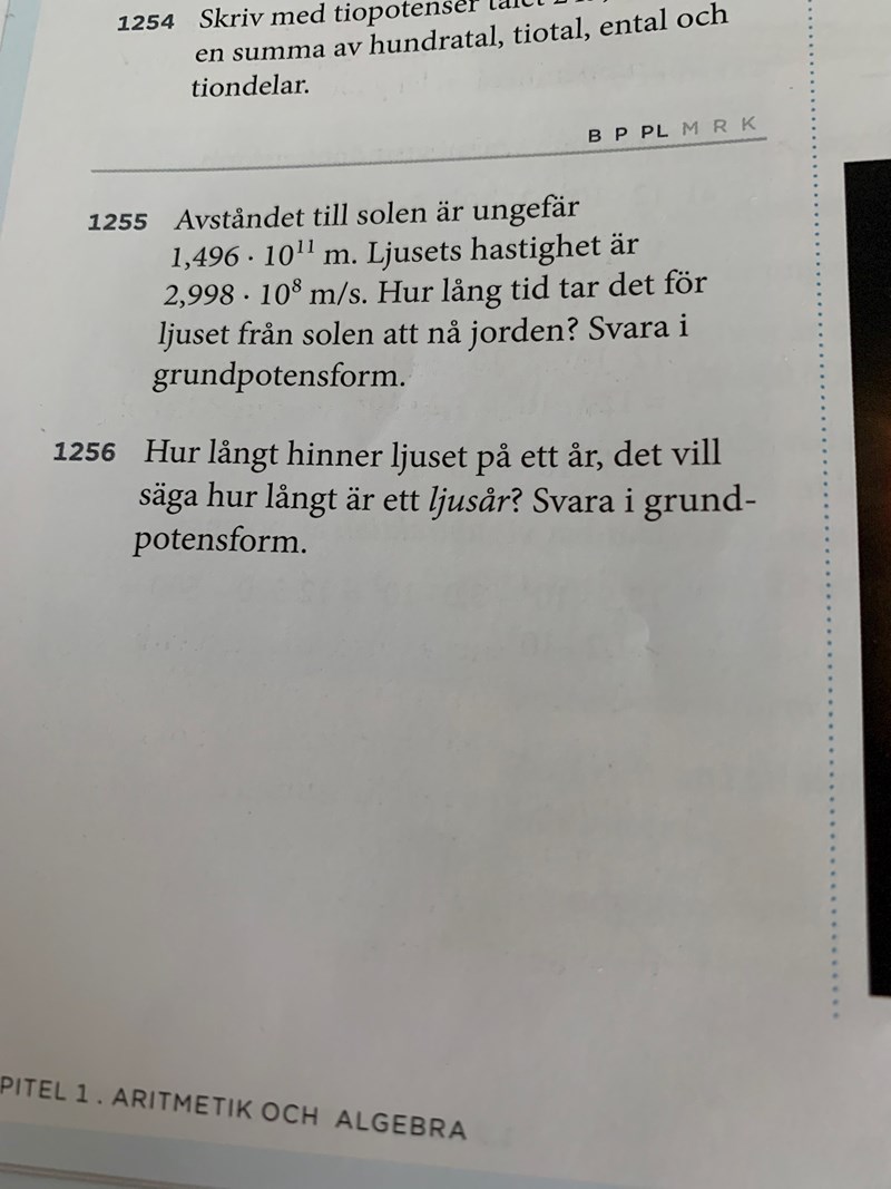 På uppgift 1256 handlar det om att du vet en hastighet v (ljusets hastighet i meter per sekund) och en tid t (antal sekunder på ett år) och du ska beräkna sträckan s (meter).