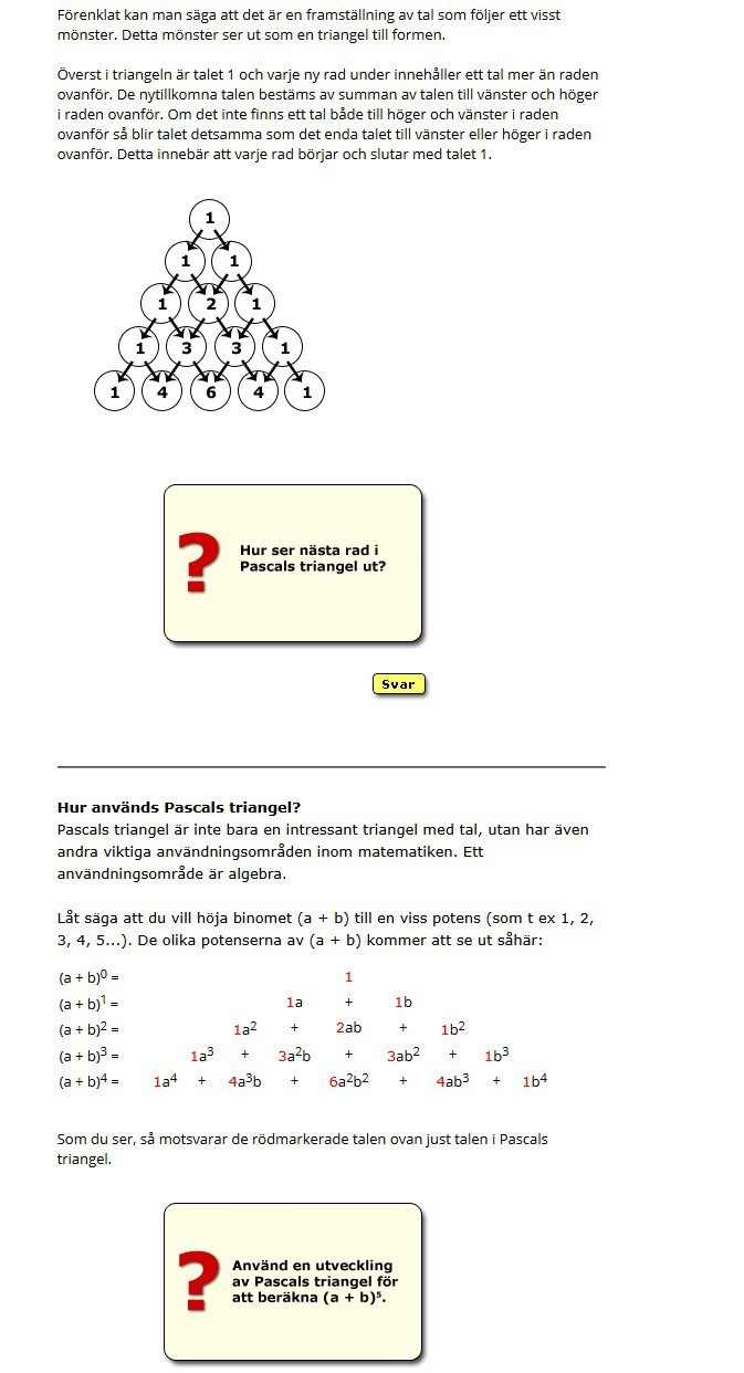 Hej, repeterar grundskolans Pascals triangel/pyramid på webmatte.se.(http://www.webbmatte.se/display_page.php?language=sv&HeadLanguage=sv&id=137&on_menu=735&page_id_to_fetch=6452&lang=swedish&no_cache=1131445138)