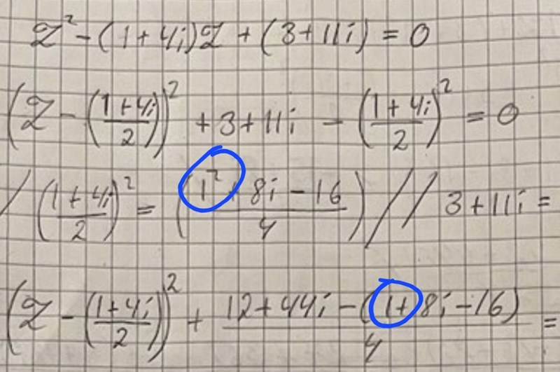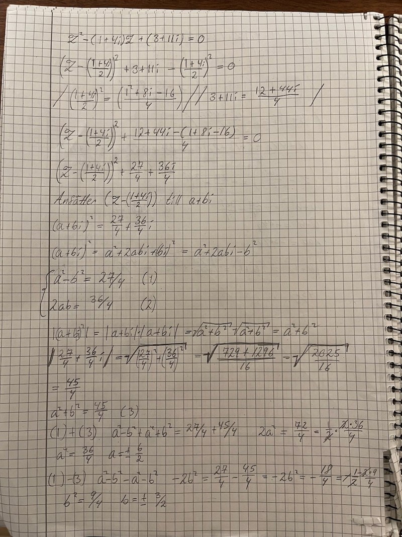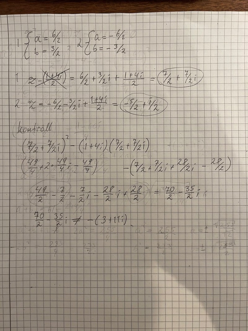 Försöker lösa en komplex andragradsfunktion men när jag kommer fram till lösningen och stoppar in det i ursprungliga uttrycket så blir det inte noll och jag hittar inte eller förstår inte vad det är som jag har gjort fel. Någon som ser vad jag gör fel?