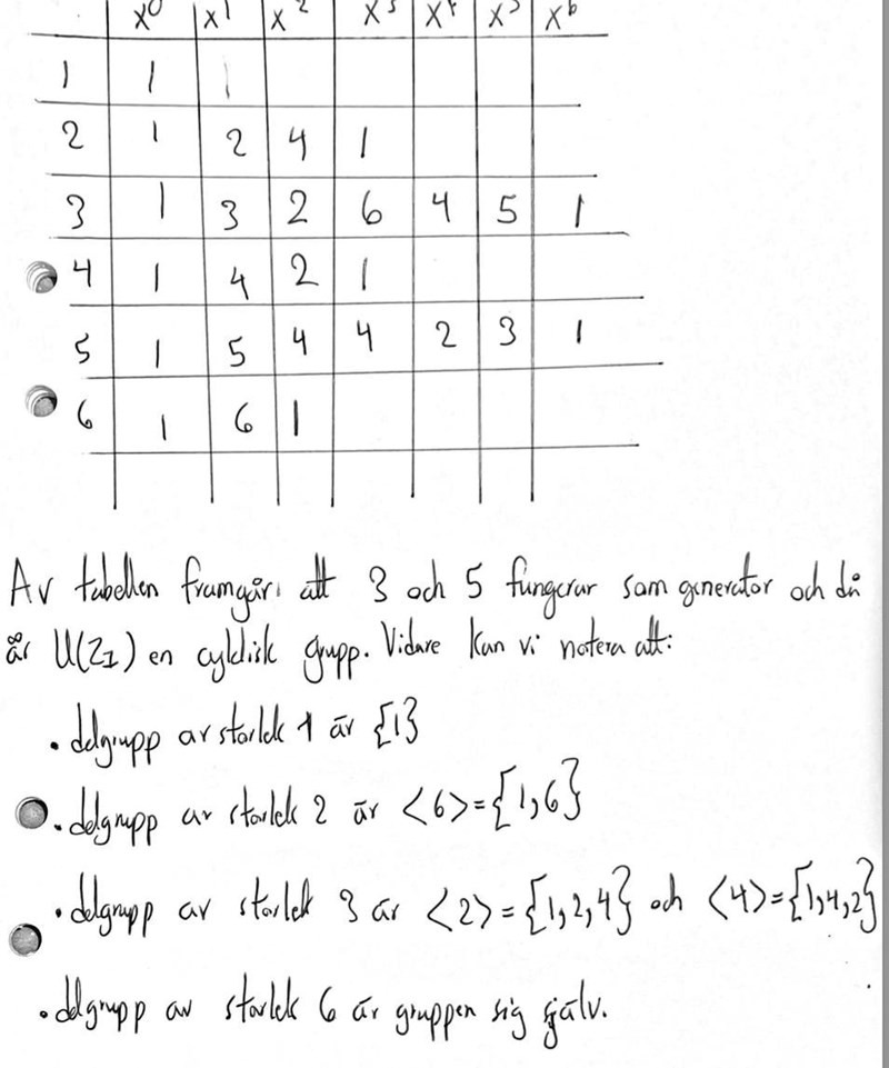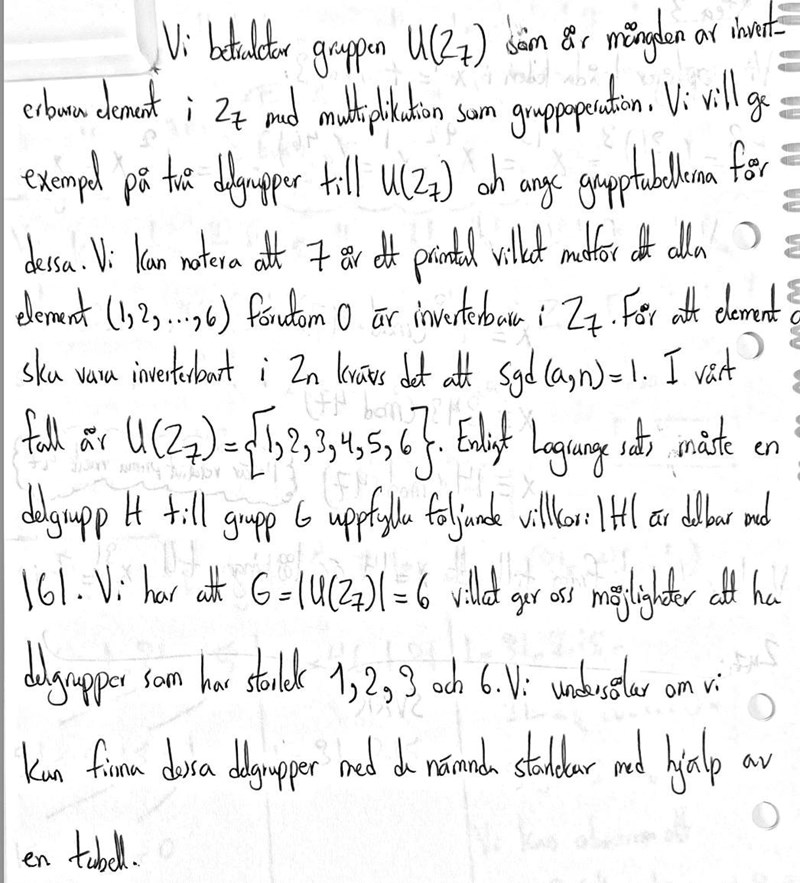 Hej! Frågan är "Ge exempel på två delgrupper till U(Z7) och ange grupptabellerna för dessa. För full poäng krävs ett argument för att delgrupperna verkligen är grupper". Jag har inte facit och jag vet inte om jag har löst rätt, blir tacksam om någon kan kolla på min lösning.