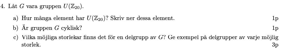 sgd(a, 20)=1 och då får vi att elementen är 1,3,7,9,11,13,17,19