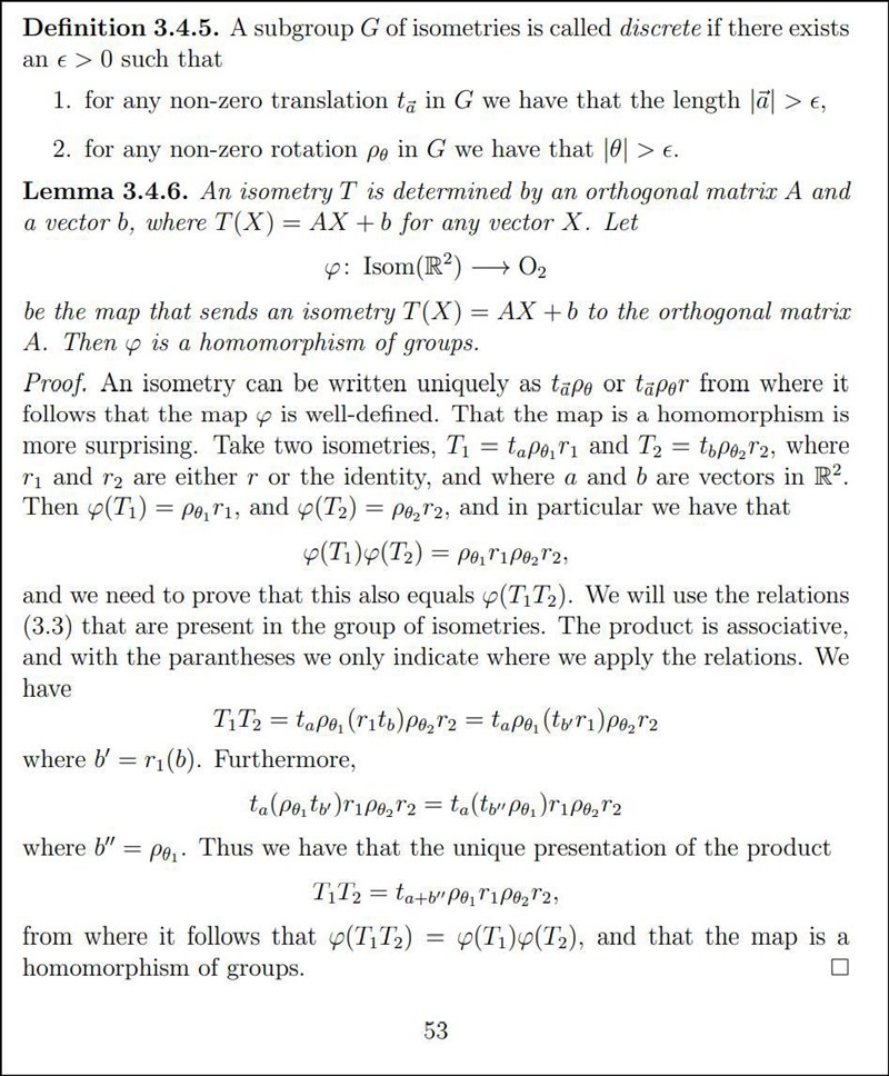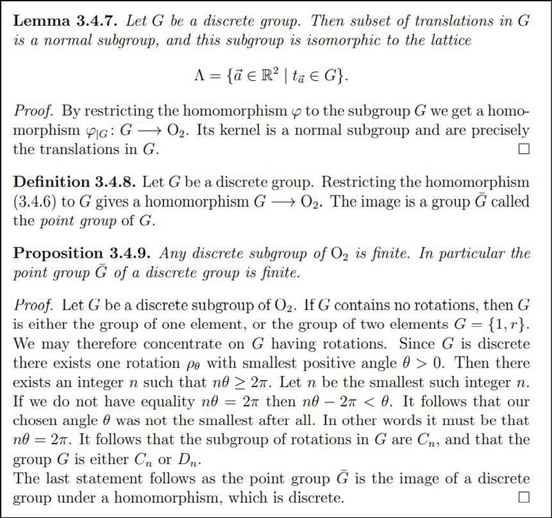 Jag kan utläsa två påståenden i lemmat: 1) delmängden är en normal delgrupp 2) den är isomorf med ett gitter. Beviset var konstigt, där påstår de bara att 3) kärnan är en normal delgrupp 4) kärnan är translationerna i G. Påstående 4) är självklart, men det är otydligt vad dess relation är till påstående 3). Beviset säger mig inget.