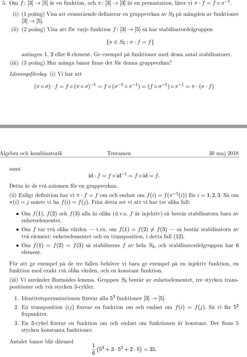 Sitter med nedanstående uppgift och har som ni ser tillgång till facit men förstår inte resonemanget. Tycker det är svårt att tolka uppgifter om gruppverkan och hur man ska tänka gällande förhållandet mellan funktion och permutation. (i) är jag på det klara med i denna uppgiften, men däremot (ii) och (iii) förstår jag inte riktigt. Vad innebär egentligen funktionen (3)-(5)? Och permutationen pi, blir inte den bara (3)?