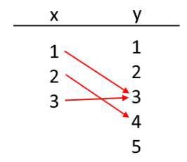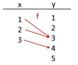 Funktionen har en startmängd med 3 objekt och en målmängd med 5. Man kan tänka på det som att de x-värden vi kan sätta in är 1,2,3 och de y-värden vi kan få ut är 1,2,3,4,5. Varje x ger ett y, men vi vet inte vilket x som ger vilket y, det beror på funktionen. En visualisering är att lista x- och y-värdena i varsin kolumn. f tar varje x till något y, vilket kan göras med pilar: