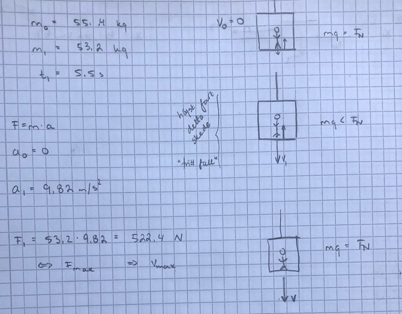 jag har försökt lösa uppgiften: "En fysikintresserad gruvarbetare tar en dag med sig n våg in i gruvhissen. Hon ställer sig först på vågen som då visar utslaget 55,4 kg. Då hissen sedan sätter igång ställer vågen in sig på 53,2 kg. Den står så ca 5,5 s för att sedan återgå till första inställningen. Denna bibehålls under en längre tid tills hissen bromsas in. Beräkna den högsta fart hissen har"