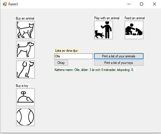 Om du tänker dig att varje knapp/ruta i windows fönstret är en egen klass. Till exempel knappen "Feed Animal" kan vara en knapp så när du klickar på knappen Feed Animal i windows fönstret hanteras det i "Feed Animal" klassen.