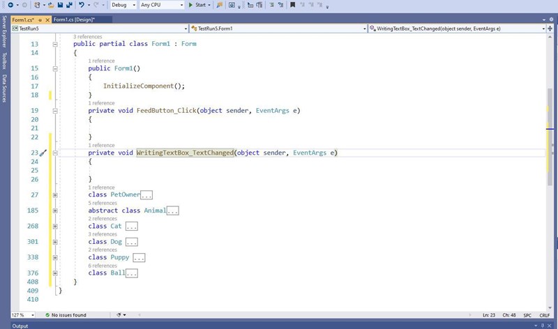 Mitt mål är att kunna trycka på knappen Feed så kommer texten(vilket djur man nu ska mata