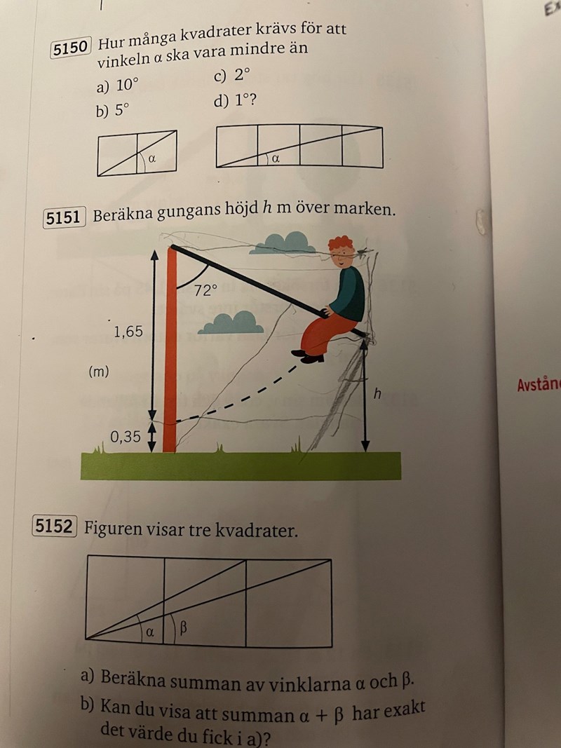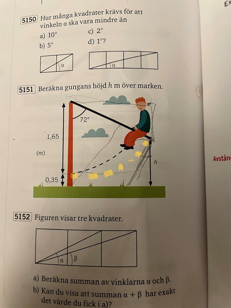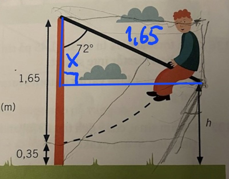 I vilket fall så bildade jag en till rätvinklig triangel ovanför med vinkel 18 grader och ena kateten längden på gungan. Räknade ut andra kateten till 0.65. Tog sedan 2 - 0.65 = 1.35m över marken. Ser inte rimligt ut om man ser till bildens proportioner.