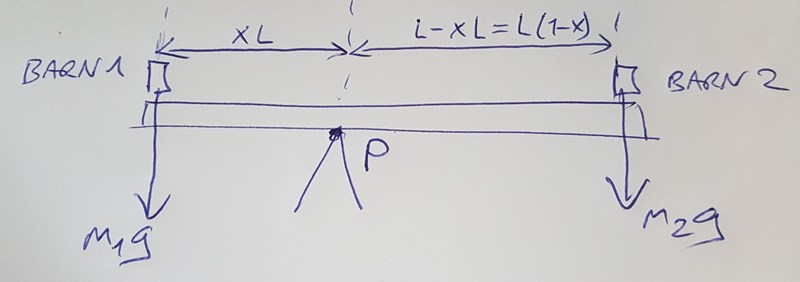 jag råka skicka fel bild. Jag begriper att x är ett avstånd men fortfarande liksom. Låt oss säga att m1 har avståndet 0.4 utav plankans längd, de kommer inte hindra de andra barnet att ha samma vikt i motsatt sida, mer vikt eller mindre. Hade jag haft konstander tillexempel hur den ser ut för den kan se ut lite hur som helst nu, vad 1 utav vikterna är och båda längderna från punkten som håller upp brädan hade jag kunnat beräkna men jag har för lite fakta enligt mig om jag ej missat något