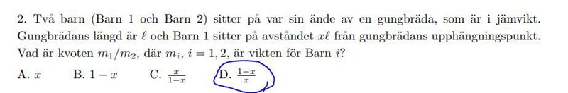 Om kvoten är m1/m2 hur blir svaret D? Eftersom barn 1 sitter på avståndet x*l borde det väl bli x/(1-x) efter man har förkortat bort l? Har inte pluggat fysik på ett år så är rostig.