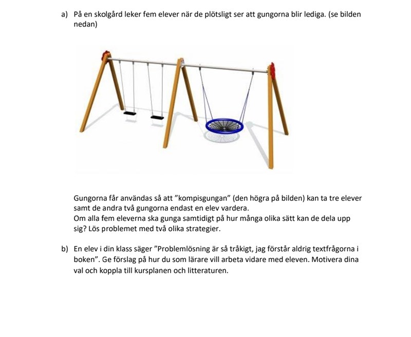 Frågan är så dåligt formulerad att jag inte vet om man bara skall ta hänsyn till vilka två elever som gungar på någon av de båda enkelgungorna (i så fall finns det 15 varianter), om man skall skilja på vilket av barnen som gungar på den yttersta gungan (i så fall finns det 30 varianter) eller om man skall ta hänsyn till de olika placeringarna i "kompisgungan" också (i så fall finns det 120 olika varianter).