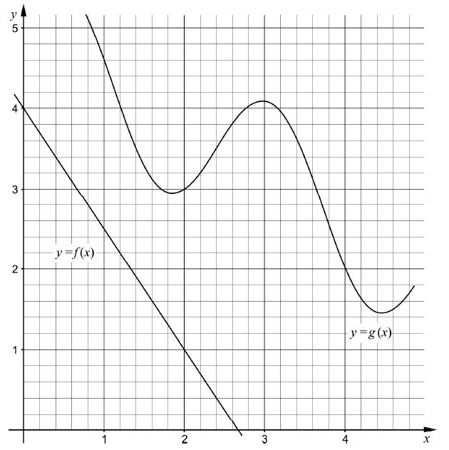 Figuren visar graferna till funktionerna f och g. För funktionen h gäller att h(x) = f(x) - g(x). Bestäm h'(2).