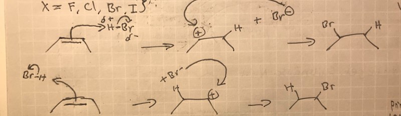 Varför spelar det ingen roll vilken sida vätet och bromet sitter på vid denna reaktion. Är det för att halogenen får sitta på ett lika balanserat kol oavsett vilken sida?