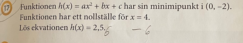 Sten skrev att f(x)=a(x+4)⋅(x−4). Du har räknat ut att a = 0,125. Sätt in att x = 2,5 i formeln.