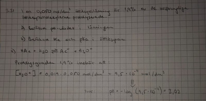 "I en 0,050 mol/dm3 ättiksyralösning är 1,9% av de ursprungliga ättiksyramolekylerna protolyserade. a) Beräkna pH-värdet i lösningen b) Beräkna Ka och pKa i ättiksyran."