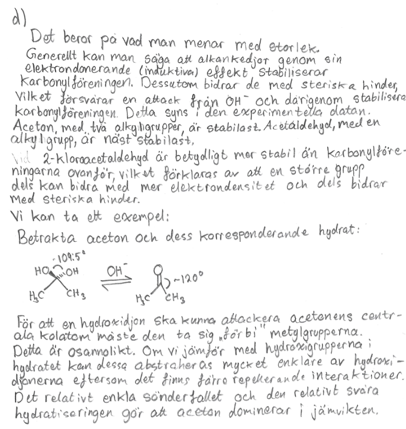 I svaret till delfråga d har du blandat ihop kinetik med termodynamik. De data som ges i uppgiften är jämviktsdata (Kd). Jämviktskonstanten Kd kan därför inte användas, inte heller förklaras utifrån kinetik. Steriska hinder vid attacken på karbonylkolet förklarar inte storleken på Kd. Sterisk påverkan på reaktionen mellan nukleofil (här vatten) och elektrofil (här karbonylförening) ger en påverkan på hastigheten, inte på jämviktssammansättningen.