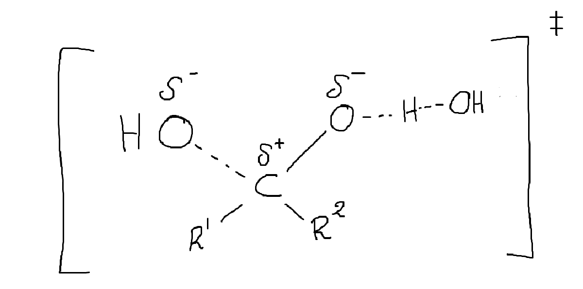 Ditt övergångstillstånd ser inte ut att stämma. Det är ett väte för mycket, och den lämnande (eller attackerande) gruppen kommer vara vatten inte en hydroxigrupp (den är en hyfsat stark nukleofil, och en dålig lämande grupp). Det borde i min mening snarare var liknande nedan (tecknen illustrerar delta +/- inte formella laddningar). Det går också att resonera utifrån att andra vattenmolekyler hjälper till att stabilisera laddningsförskjutningarna.