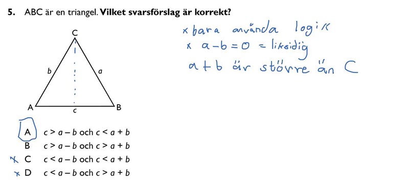 Triangelolikheten ger direkt att c < a + b, vilket gör att B och C är fel.