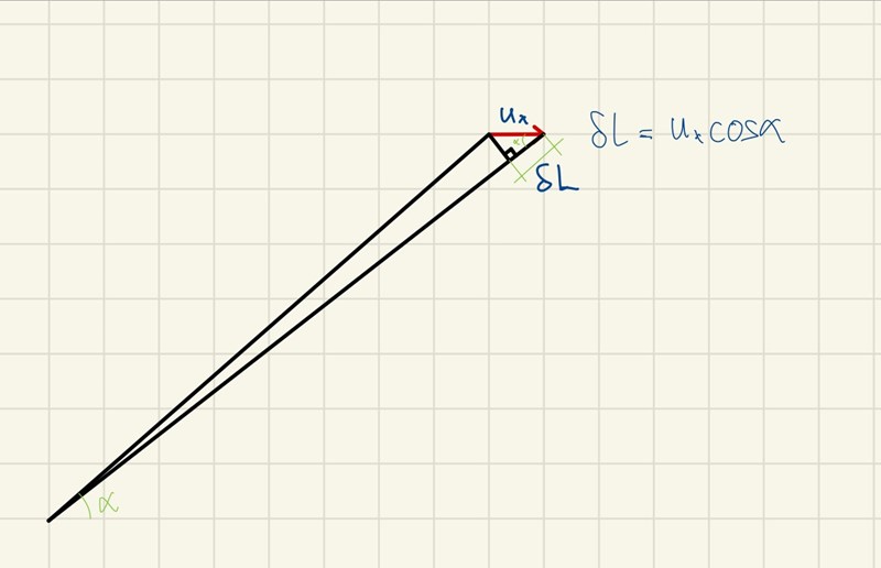 Har du möjlighet att utveckla på hur superponeringen fungerar? På bilderna ser det ut som att du har fått två ekvationer för delta*L så ätt man kan uttrycka u_x i u_y.