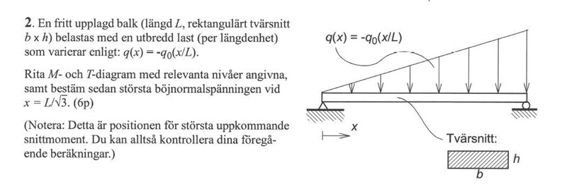 Förstår hur man skall gå vidare med integraler och sånt för att ta fram T och sedan M, men för att göra detta behöver jag de två reaktionskrafterna så jag kan få fram de två konstanterna som uppstår när jag integrerar, vet dock ej hur man får fram dem när det är en varierande utbred last