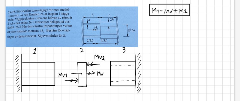 förstår inte riktigt hur jag ska tänka när jag frilägger uppgifter som denna. Jag förstår att man delar upp problemet i tre delar där man frilägger delen där momentet läggs på. Men borde inte M1=Mv då det är samma cylinder? ( se min bild) det rätta svaret är det som står upp i hörnet vilket ej stämmer med min friläggning.