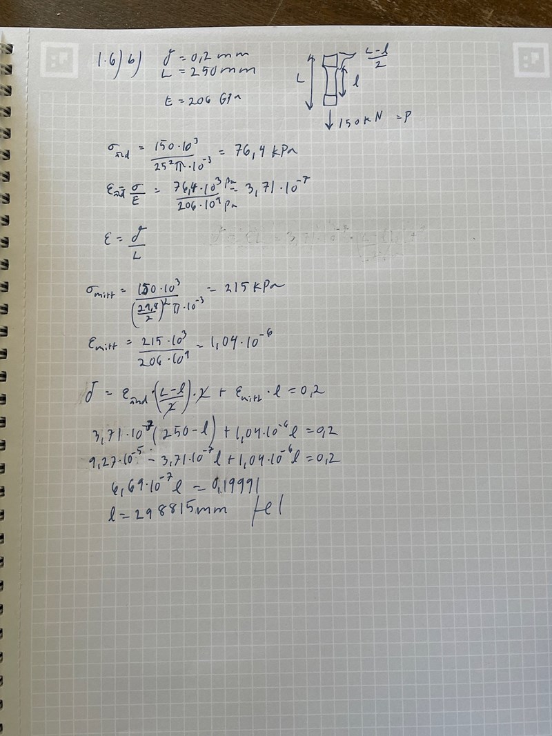 Jag får inte rätt på mina uträkningar. Är det olika spänning i de olika delarna? Nu har jag räknat det som två olika töjningar i de olika delarna - är det ett korrekt tillvägagångssättf