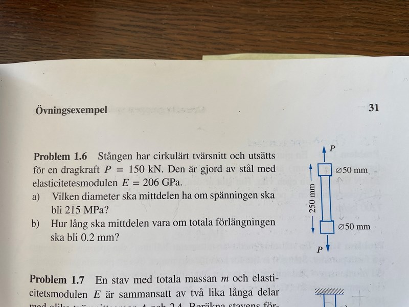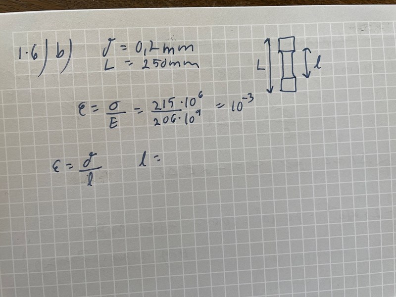Aha, tack! jag är med på att ändtöjningen jag räknat tidigare var fel. Men nu får jag längden till större än hela stångens längd och i meter (så ännu mer för stor). Jag har gjort om det så att jag räknar i meter istället hela vägen för att det inte ska bli fler sånna missar.
