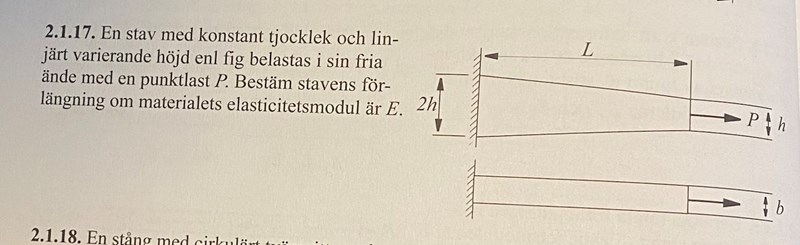 Snitta en tunn skiva, dx tjock, och beskriv arean för den som en funktion av x. På den tunna skivan kan du använda uttrycket för delta om vi antar att skivans area är konstant för den och det kan vi om dess tjocklek är infitesimal. När du räknat ut delta för den skivan så kan du göra likadant för alla skivor i stångens längsled, dvs för 0<= x <= L och det gör du, som du misstänkt, genom att integrera uttrycket för delta över x-intervallet. Integrationen är ju bara en summering över ett jättestort (oändligt) antal skivor med jätteliten (oändligt liten) tjocklek.