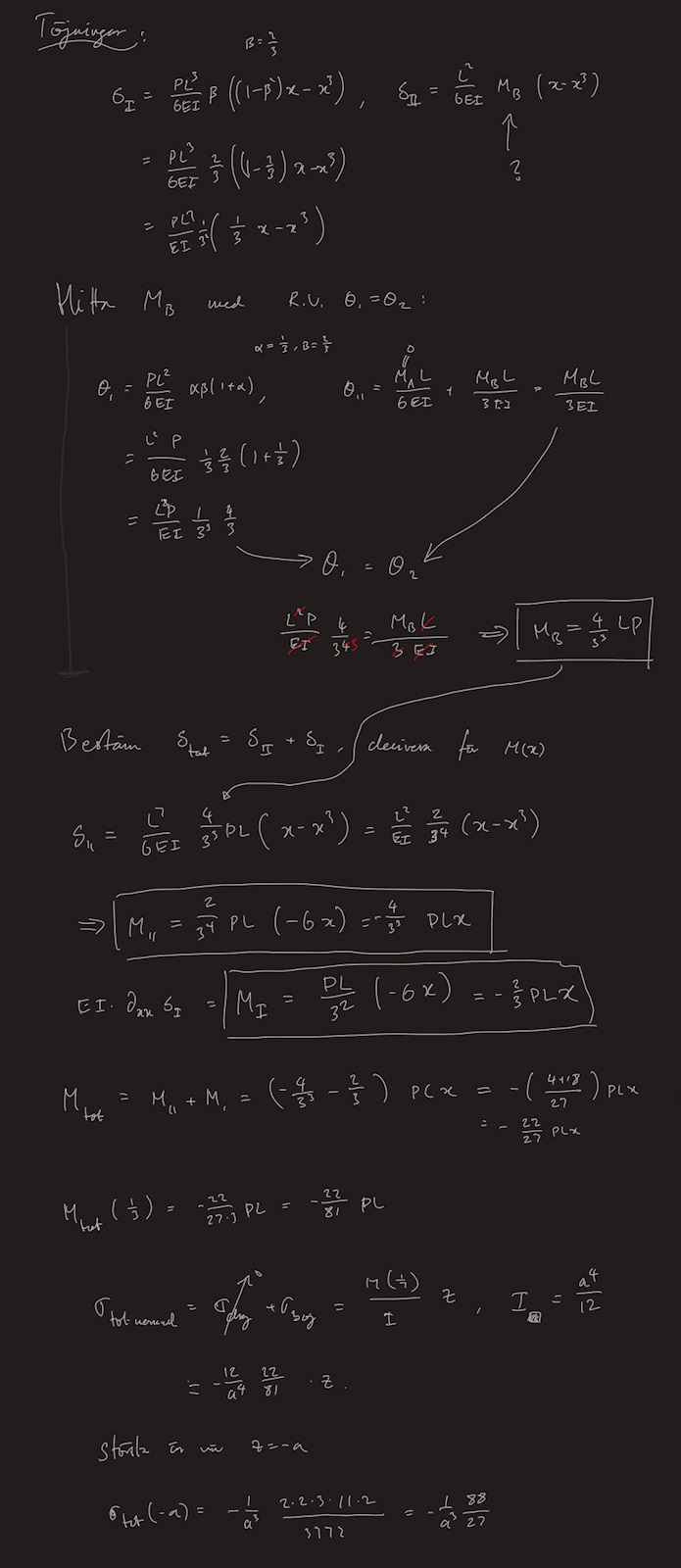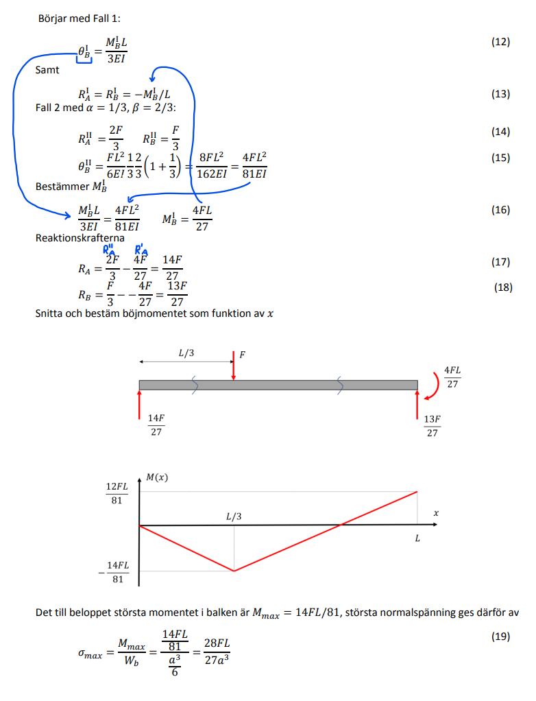 Jag gör på samma sätt tills ekvation 18 och jag får samma . Efter det snittar de för att hitta M(x), men jag tänkte bara räkna ut det genom att derivera förskjutningen eftersom jag redan får uttrycket för det i formelsamlingen för elementarfall.