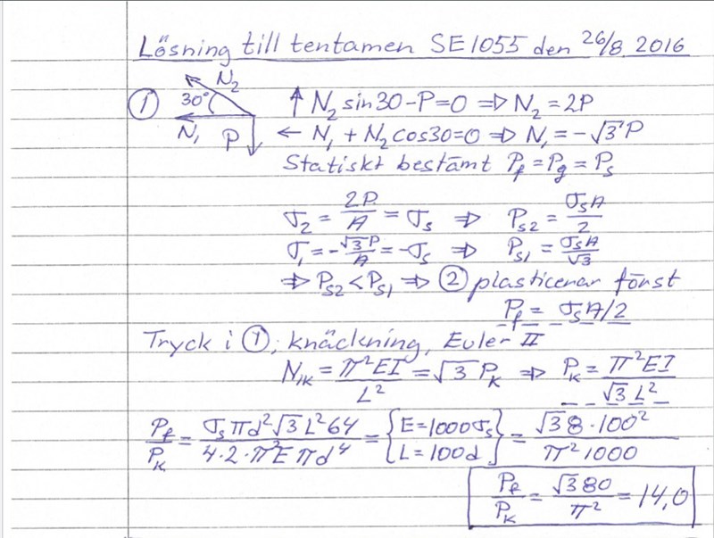 Hur kommer det sig att om problemet är statiskt bestämt implicerar det att ? Hittar ingenting angående det i kursmaterialet. För det andra, varför kollar dem på knäckning endast för stång 1 och inte 2?