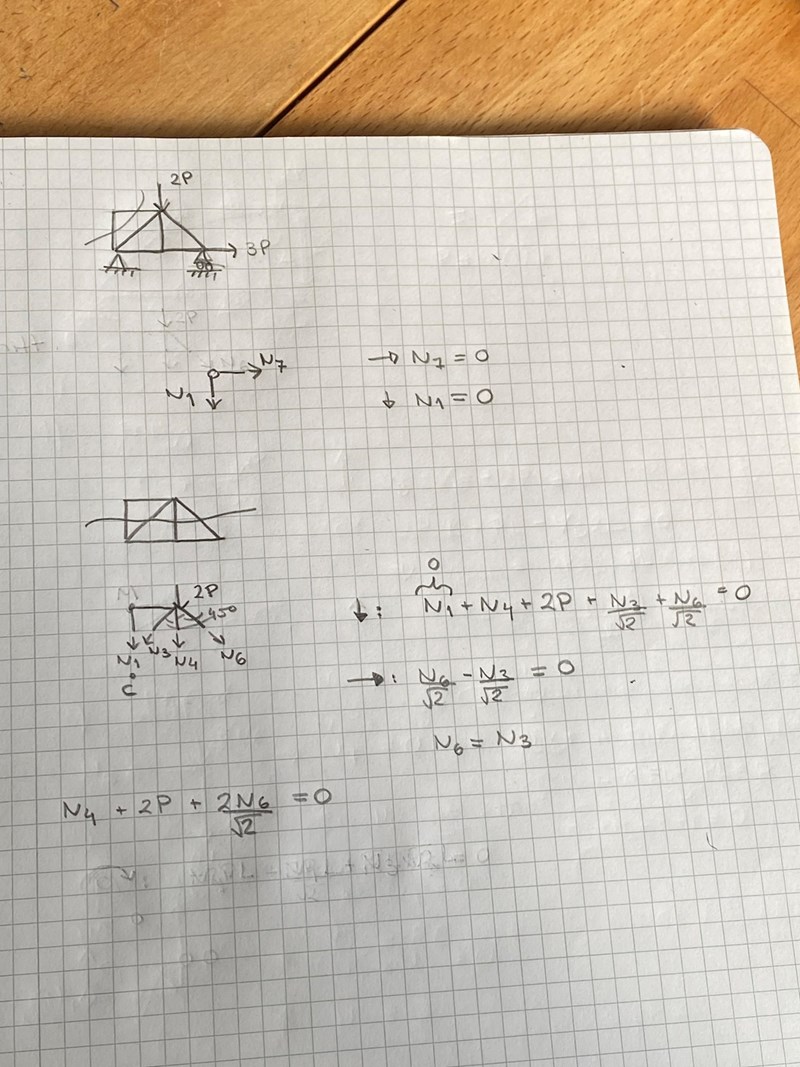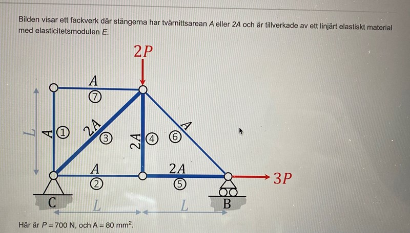 först snittade jag 1 och 7 för att få fram dom stångkrafterna. Därefter snittade jag rakt över eftersom jag då skulle få 3 okända och 3 ekvationer. Men nu har jag lyckats skriva upp 2 ekvationer och vet inte vad den 3e ska vara? Moment eller kompabilitet?