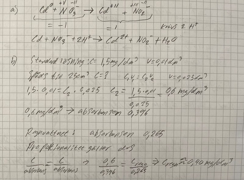 a) skriv reaktionsformel för när nitratet reduceras till nitrit i reduktorn (kadmium oxideras till Cd2+)