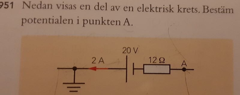 Ture skrev:Börja i den jordade punkten, sen går vi mot strömriktningen genom batteriet då sjunker spänningen 20 V, så mellan motståndet och batteriet har vi - 20 V sen går vi vidare till höger, mot strömriktningen, då stiger potentialen över motståndet med 2*12 = 24 V Alltså har vi + 4 V i pkten A.