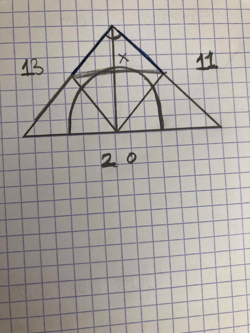En halvcirkel är inskriven i en triangel med basen 20, höjden x och sidorna 13,11. Jag har verkligen försökt men det går ej provat typ 20 gånger. Varken trigonometri eller pythagoras fungerar. Det man ska göra är att ta reda på halvcirkelns diametern.