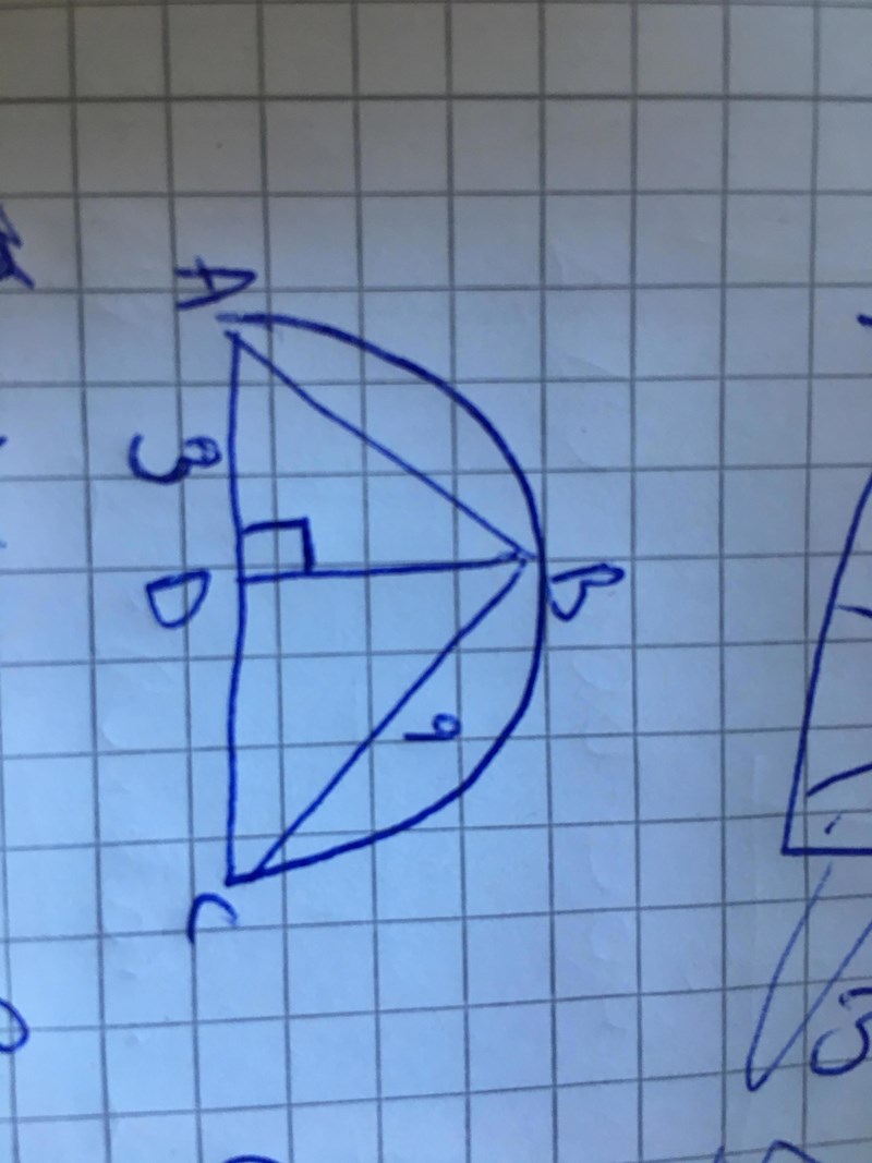 Jag tänker att linjen BD är x och sen använder jag Pythagoras sats för att räkna ut de andra sträckorna. Tex har jag tagit X/roten ur 9^2-x^2 = 3/X då fick jag ut att radien är 5,55. Men när jag tog x/3 = 9/roten ur 3^2+x^2 fick jag radien till att bli 5,18. När jag sätter in mina svar i Pythagoras sats osv för att se att de blir rätt får jag olika svar på sidorna av likhetstecknet så något är fel...