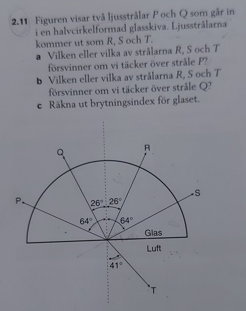 Nej för jag behöver veta brytningsindex men däremot så kan jag av figuren se att det är 41 grader. Det är P som bryts och inte Q eftersom brytningsvinkeln ska vara mindre än infallsvinklen. Jag hänger dock inte med på hur P både bryts och reflekteras