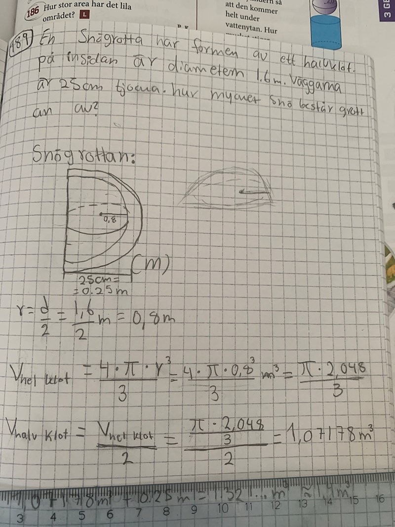 En snögrotta har formen av ett halvklot. På insidan är diametern 1,6 m. Väggarna är 25 cm tjocka. Hur mycket snö består snögrottan av? Avrunda till tiondelar.