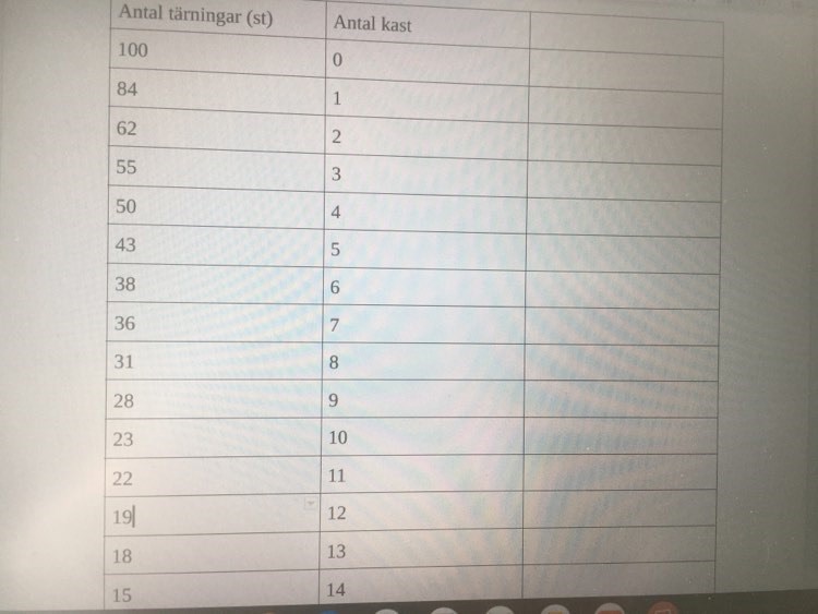 Ska beskriva sönderfallet av atomkärnor genom att kasta 100 st tärningar. Här är mitt resultat, behöver hjälp med att tyda det. Tycker inte det stämmer överens med tabellen riktigt.
