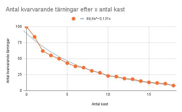 Hej, i den matematiska modellen (anpassningen av en exponentialfunktion till dina mätvärden) så är det ursprungliga antalet tärningar 89,6 och alltså inte 100.