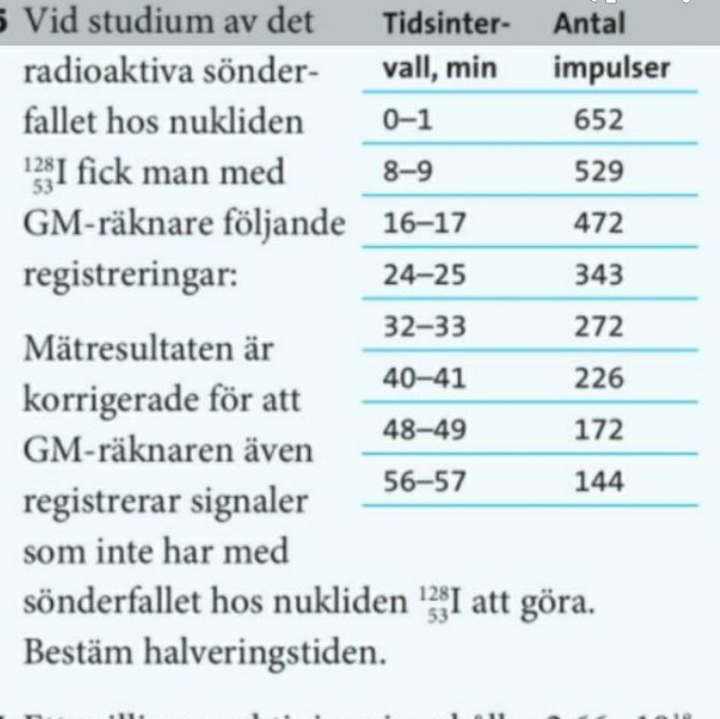 Ibland kan det vara bra att attackera problemet bakifrån om du inte vet vart du ska börja. Du vet att halveringstiden är , för att kunna ta reda på halveringstiden så behöver du alltså ta reda på sönderfallskonstanten och den kan du få genom att plotta den naturliga logaritmen av aktiviteten mot tiden där sönderfallskonstanten motsvarar lutningen i plotten.
